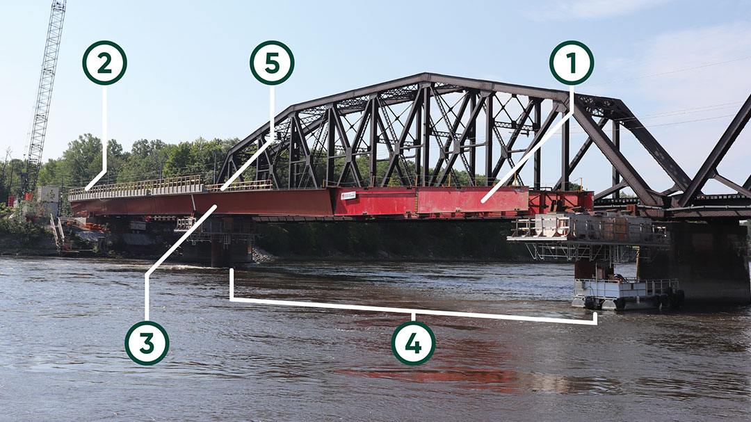In all, the Rivière des Prairies railway bridge consists of three spans (span = the distance between two bridge piers). The spans are each 30 metres long , except for the span across the river, which is 60 metres long. Using the bridge launching method, placing the bridge girders on the piers can be carried out quickly while limiting the risks associated with working in Rivière des Prairies currents.