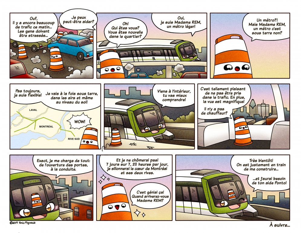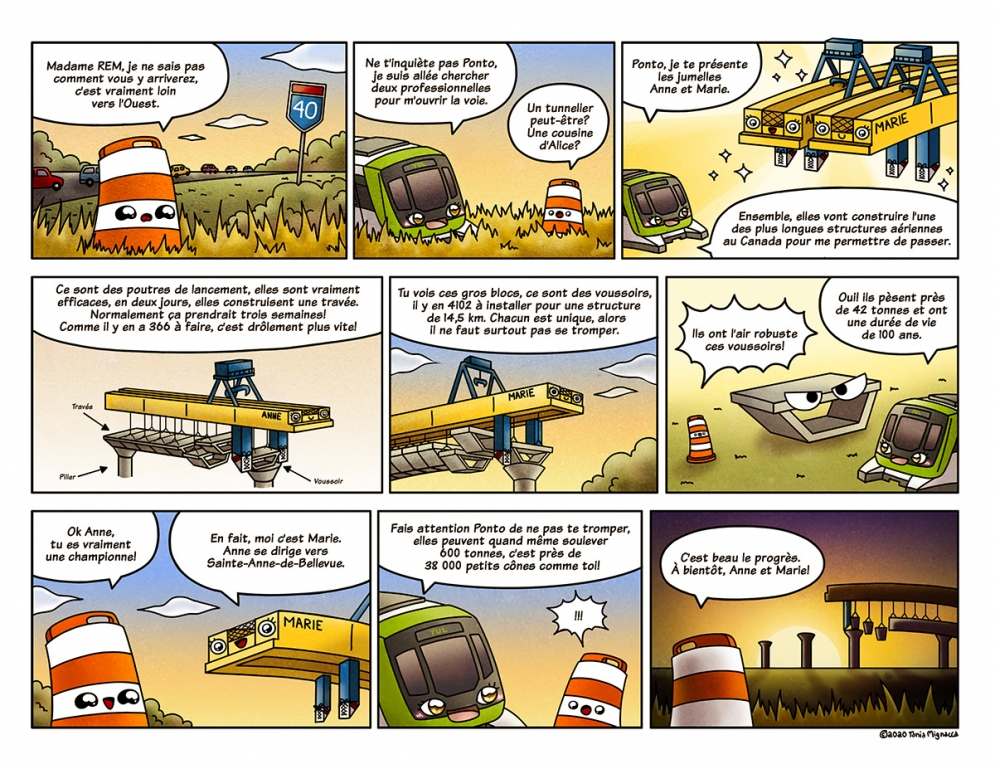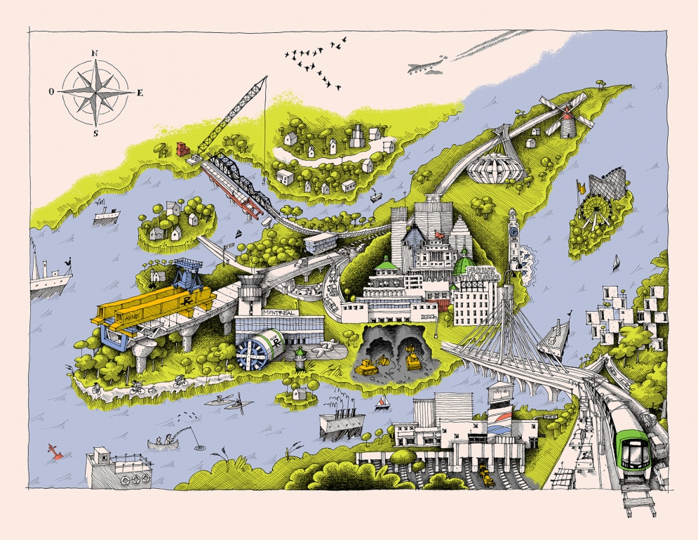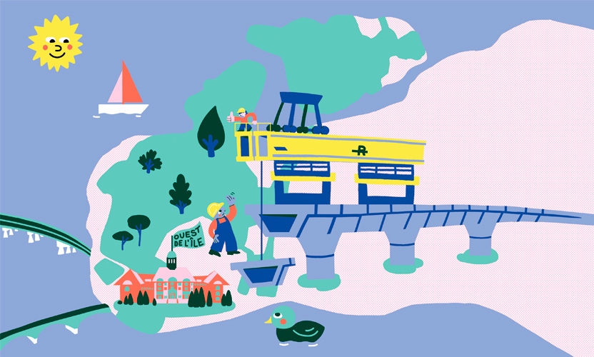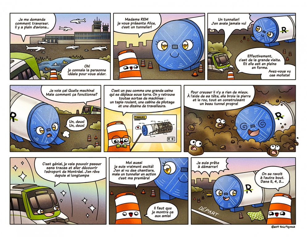 Illustration by Camille Pomerlo / Search and find REM! Find the launching beams, the tunnel boring machine and the REM car in the heart of Greater Montreal!