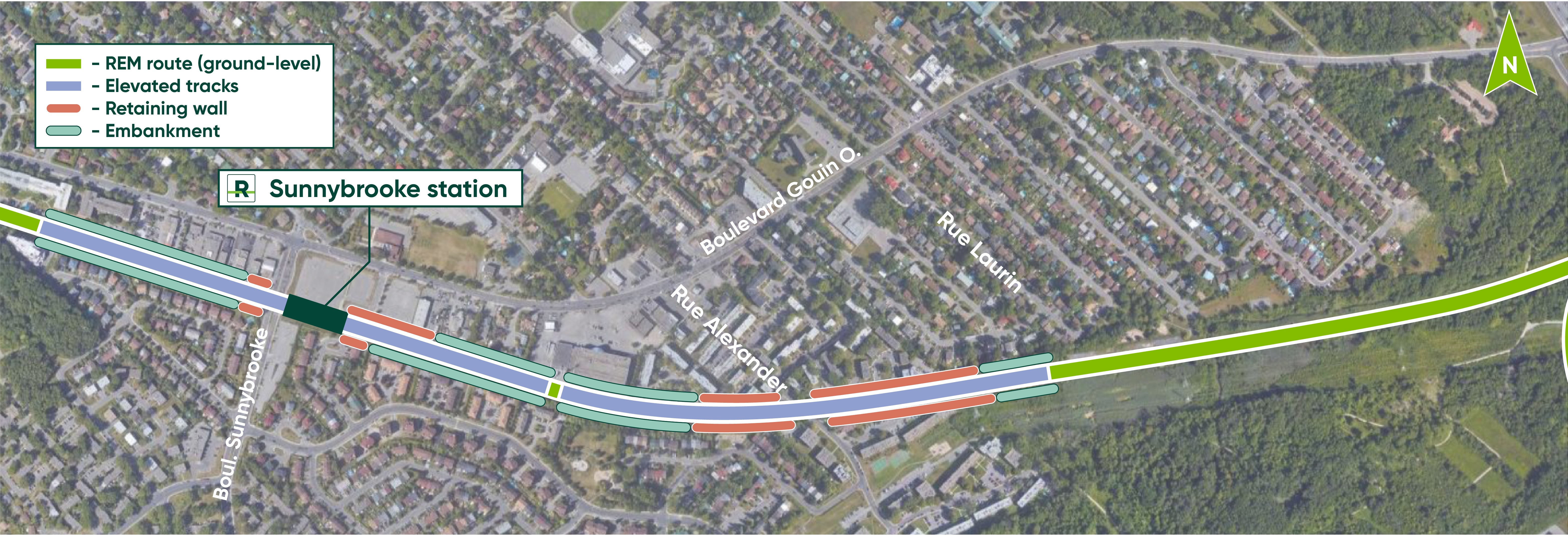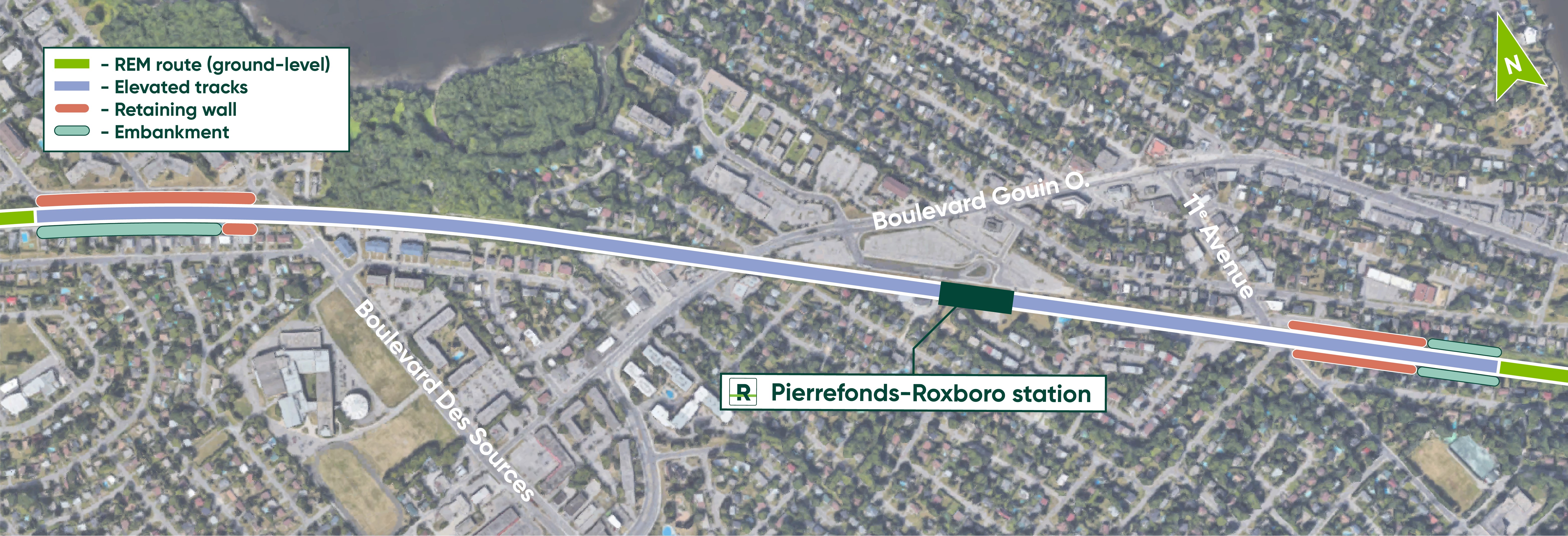 The REM will run in part on existing rail corridors. To ensure safety on this high frequency network, there will be no grade crossings. In Pierrefonds-Roxboro, the grade crossings on Alexander Street and Sunnybrooke Boulevard will be transformed into railway overpasses. The grade crossings at 11th Avenue, Gouin Boulevard West and Des Sources Boulevard will be eliminated with the construction of a 1.6-kilometre elevated structure.