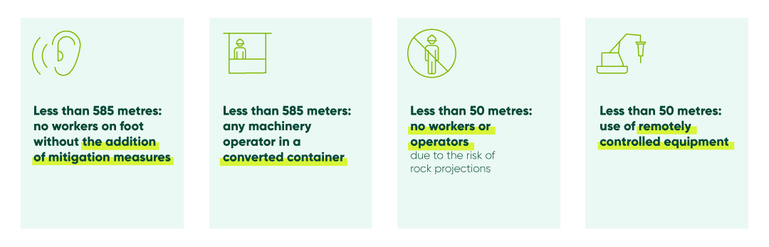 These measures include the respect of exclusion zones for workers during drilling activities and the use of remotely controlled equipment to ensure the safety of site personnel.