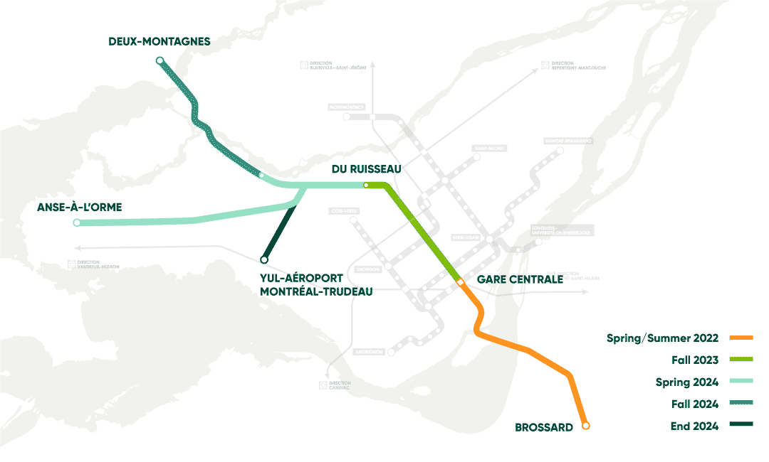 Commissioning of the South Shore to Central Station segment is postponed to Spring/Summer 2022. On the Deux-Montagnes line, the commissioning will still be done by segment (fall 2023 for the Central Station to Du Ruisseau segment, spring 2024 for Du Ruisseau to Sunnybrooke and fall 2024 for Sunnybrooke to Deux-Montagnes). Commissioning of the West Island segment is scheduled for spring 2024 and that of the airport antenna is scheduled for the end of 2024.