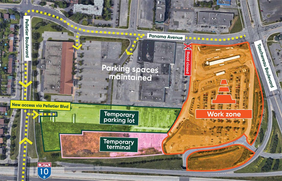The temporary parking lot will be opened at the end of November / beginning of December, followed by the temporary bus terminal shortly. A new access has been built on Pelletier Boulevard to access the parking lot. The total number of parking spaces will remain the same.