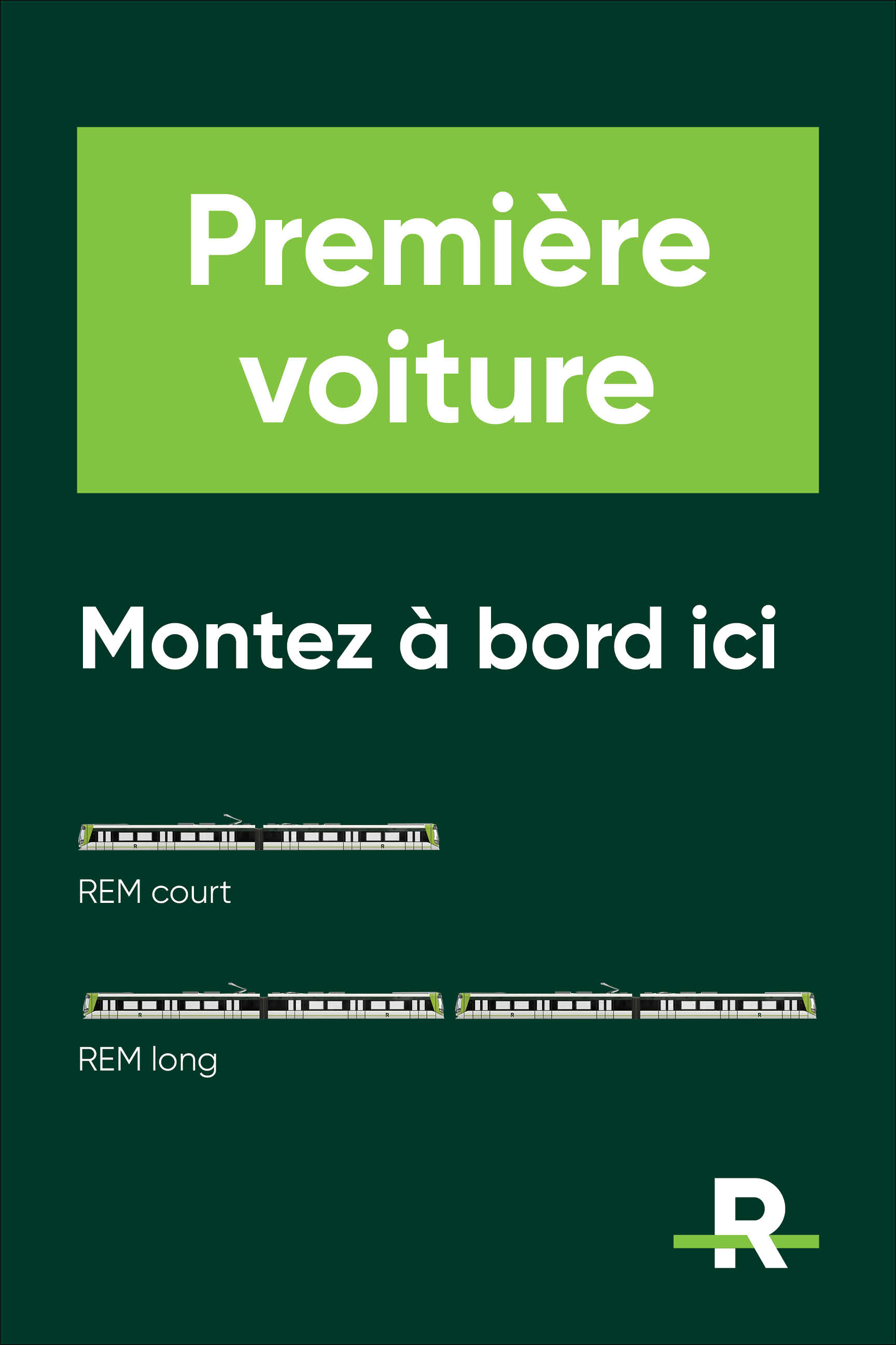 Temporarily, to find the right platform screen doors for boarding, look for the “1ère voiture” (first car) signs on the platform in the station. REM agents will be on hand in the stations to answer your questions and provide assistance if needed.