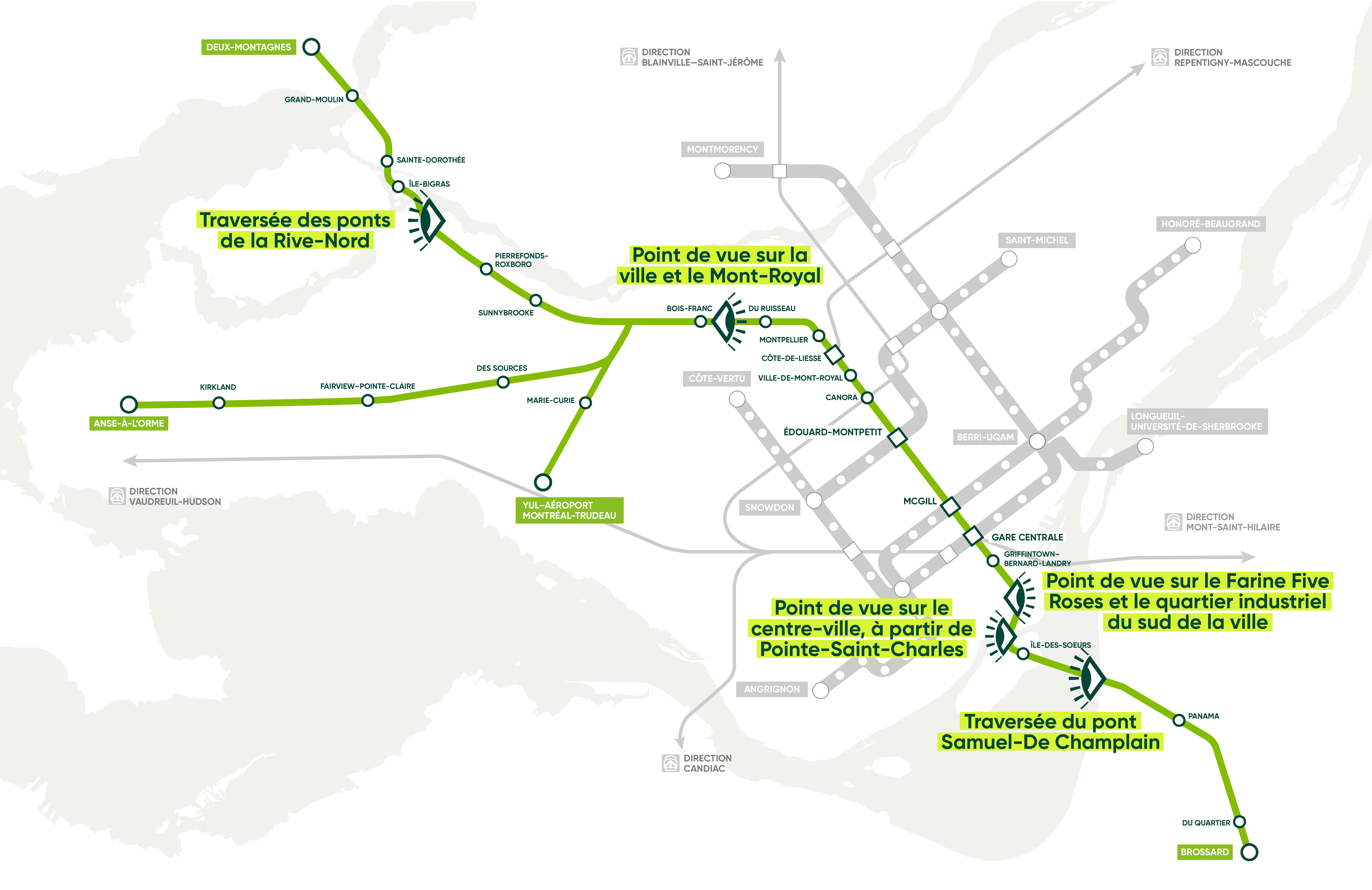 Après son passage sur le pont Samuel-De Champlain qui offrira un panorama grandiose, le REM parcourra une structure aérienne dans le secteur de Pointe-Saint-Charles. D'une dizaine de mètres de hauteur, cette structure permettra d’avoir une vue sur des lieux emblématiques du centre-ville, comme le 1000 de La Gauchetière, la Place Ville-Marie, le Mont-Royal et plus.