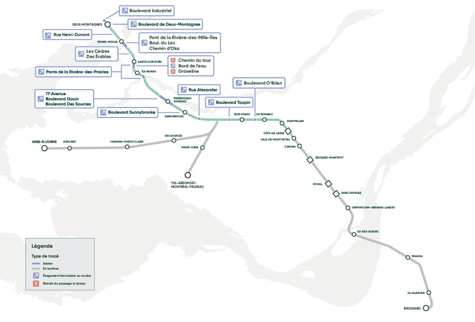 On retrouve des passages à niveau à 17 endroits le long du tracé du REM, entre Deux-Montagnes et l’arrondissement Saint-Laurent. Lorsque l’ancien train de la ligne Deux-Montagnes passait à l’un de ses endroits, la circulation routière, piétonne et cycliste était interrompue.