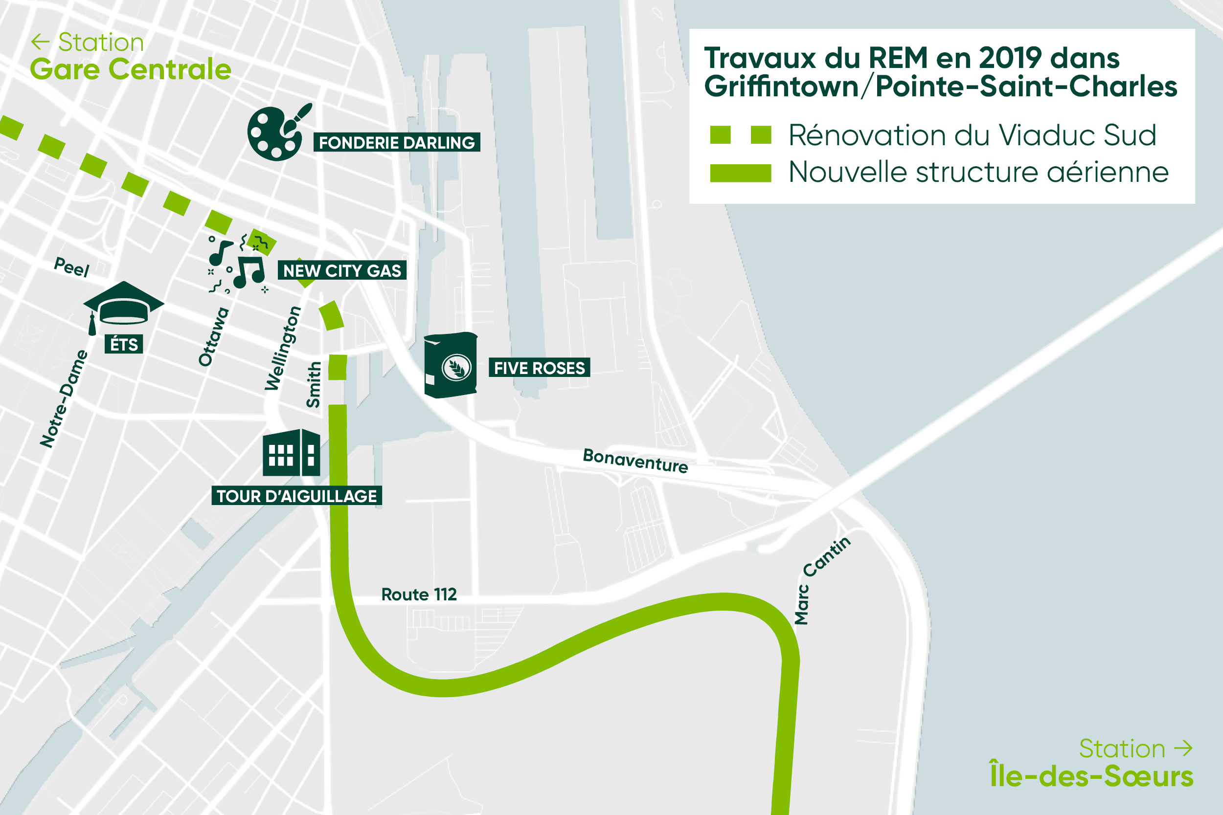 - Côté Griffintown : les équipes procèdent à la rénovation du Viaduc Sud, c’est-à-dire le viaduc ferroviaire reliant la gare Bonaventure jusqu’au canal.