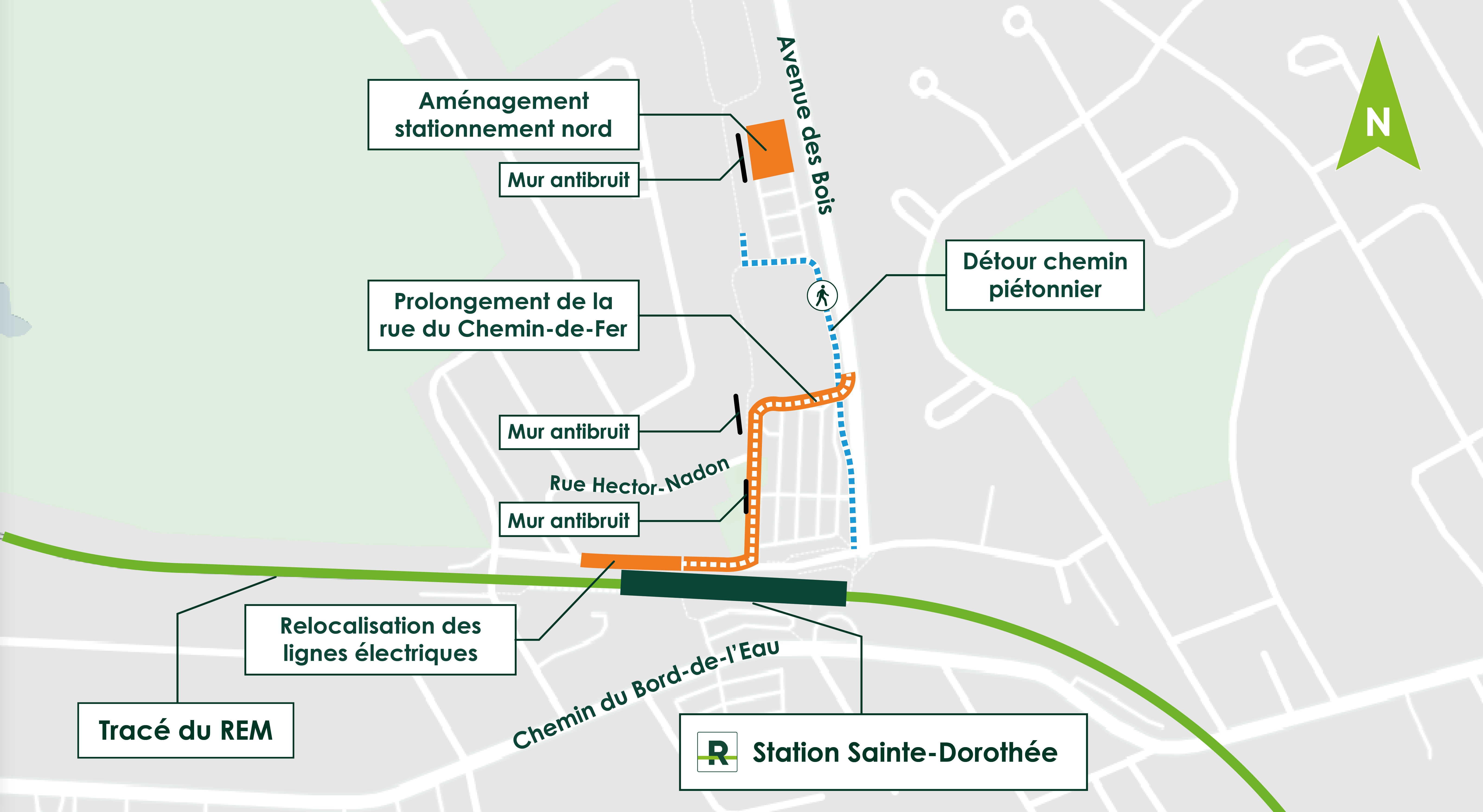 Dans le cadre des travaux du REM dans le secteur de Sainte-Dorothée, des aménagements routiers seront réalisés afin d’éliminer les passages à niveau actuels pour faciliter le passage du futur REM et assurer la sécurité de tous. Étant donné que la configuration de l’avenue des Bois sera modifiée pour passer sous les voies ferroviaires, un réaménagement de la rue du Chemin-de-Fer s’avère nécessaire. Cette dernière sera prolongée en longeant l’actuel stationnement incitatif et se raccordera plus au nord sur l’avenue des Bois.
